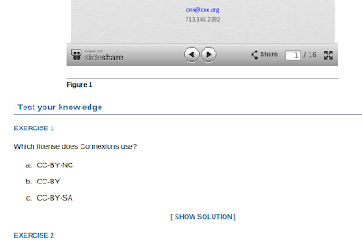 I am wondering whether it would be possible to provide a little quiz wizard with the slide tool also, inspired by TED-Ed’s tool for creating quick lessons out of YouTube videos. This TED-Ed example shows a video that has been embedded with some intro text and a little quiz. It looks a lot like what I was envisioning for a slide module, although the presentation would necessarily look a bit different given the Connexions format. I added a quiz section to the sample module I created in Connexions to get an idea what that might look like.