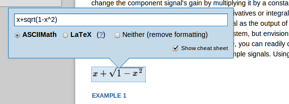 Modest ambition and live preview: First, we aren’t trying to build a WYSIWYG math editor. Instead we are building an editor that will accept LaTeX or ASCIIMath notation and will produce a live preview of how the math will look. We use MathJax to do most of the heavy lifting.